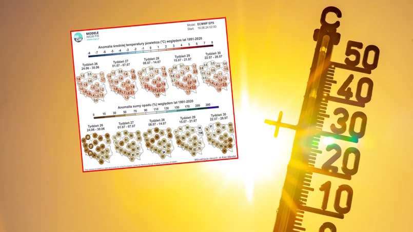 Ostatni tydzień czerwca będzie dużo cieplejszy niż zwykle. Temperatury będą wyższe od tych, do których przywykliśmy, a opadów będzie wyjątkowo mało - wynika z długoterminowej prognozy, którą prezentuje Centrum Modelowania Instytutu Meteorologii i Gospodarki Wodnej. Model anomalii średnich temperatur i opadów w Polsce przygotowali meteorolodzy z Europejskiego Centrum Średnioterminowych Prognoz Pogody.