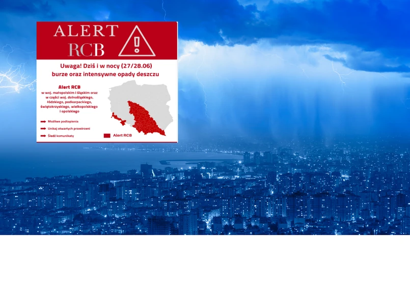 "Uwaga! Dziś i w nocy (27/28.06) możliwe burze z intensywnymi opadami deszczu. Prawdopodobne lokalne podtopienia. W czasie burzy znajdź bezpieczne schronienie" - ostrzega RCB.