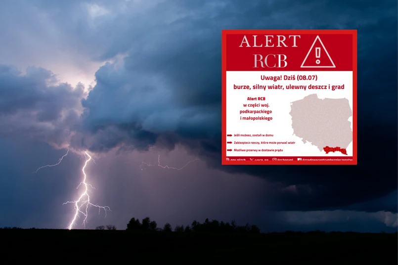 "Uwaga! Dziś (08.07) burze, silny wiatr, ulewny deszcz i grad. Możliwe przerwy w dostawie prądu. Zabezpiecz rzeczy, które może porwać wiatr" - czytamy w komunikacie RCB na portalu X.